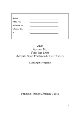 Sinopsis Buku: Buku ini mengajak pembaca untuk mengenal dan memahami cara menulis surat pembaca yang efektif, kreatif, dan sesuai dengan gaya bahasa koran. Penulis, Dicki Agus Nugroho, membagikan pengalaman pribadinya dalam menulis surat pembaca yang pernah ia kirimkan ke berbagai surat kabar, termasuk Kompas dan Kedaulatan Rakyat. Dalam buku ini, ia menjelaskan proses munculnya ide-ide yang kemudian dituangkan dalam bentuk surat pembaca, serta memberikan contoh-contoh tulisan yang bisa menjadi referensi bagi pembaca pemula. Buku ini sangat cocok bagi siapa pun yang ingin memulai menulis tulisan pendek, mulai dari dua atau tiga paragraf, yang bisa tayang di surat kabar. Dengan gaya bahasa yang santai dan mudah dipahami, buku ini menjadi panduan praktis bagi para pustakawan dan penulis pemula yang ingin berpartisipasi dalam dunia menulis surat pembaca.