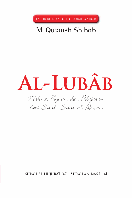 Al Lubab bias diartikan sebagai substansi jika dikaitkan dengan wujud atau isi dan saripati jika dikaitkan dengan buah Di samping merangkum pengertian pilihan terbaik dari segala sesuatu kata ini juga digunakan untuk melukiskan akal yang cerdas pikiran yang jernih seta hati yang tenang Buku ini berjudul AL Lubab karena menyajikan bentuk penafsiran yang ringkas dan padar Dalam khazanah tafsir gaya penyajian semacam ini dikenal dengan metode ijmali di mana ayat ayat Al Quran tidak membahas secara terperinci melainkan hanya makna makna umumnya Buku ini memperkenalkan secara singkat surah surah Al Quran baik yang berkaitan dengan intisari kandungan ayat ayatnya tujuan kehadiran surah tersebut maupun pelajaran atau pesan singkat yang dikandungnya Dengan mengetahui intisari kandungan ayat dapat dikenal kandungan surah Dengan menghayati tujuan surah terbuka kemungkinan mengayunkan langkah menuju tujuan itu Dan dengan memperhatikan pelajaran dan pesan pesan singkat yang terhidang tekad untuk melaksanakannya semoga semakin kukuh sehingga tercapai tinkat Ulul Albab Buku ini bukan saja cocok bagi kalangan remaja dan mereka yang sibuk tetapi juga sangat bermanfaat bagi siapa saja yang ingin menangkap keutuhan pesan Al Quran dalam waktu singkat