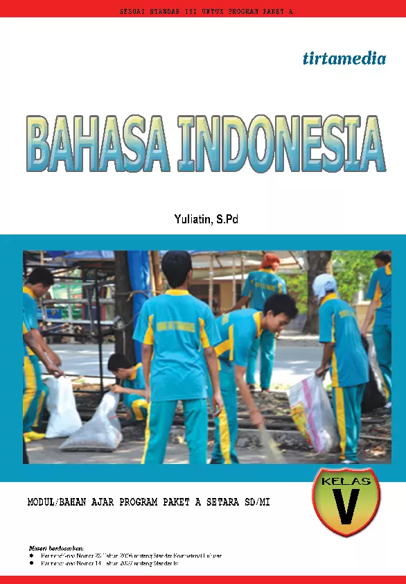 Sinopsis Buku: Buku ini merupakan bahan ajar yang dirancang untuk membimbing siswa kelas V Sekolah Dasar (SD) atau Madrasah Ibtidaiyah (MI) dalam mempelajari mata pelajaran Bahasa Indonesia. Buku ini tergolong dalam Program Paket A, yang setara dengan kurikulum SD/MI. Buku ini terdiri dari beberapa bab yang disusun secara terstruktur dan sistematis untuk membantu siswa dalam memahami konsep-konsep dasar bahasa Indonesia, seperti mendengarkan, berbicara, membaca, dan menulis. Bab pertama membahas tentang Bersikap Jujur, yang meliputi keterampilan mendengarkan, berbicara, membaca, dan menulis karangan berdasarkan pengalaman. Bab kedua berjudul Peristiwa, yang memperkenalkan siswa pada cara mengenali, menggambarkan, dan menganalisis peristiwa dalam kehidupan sehari-hari. Bab ketiga berisi tentang Kegiatan, yang melibatkan siswa dalam berbagai tugas dan aktivitas yang melatih kemampuan berbahasa secara menyeluruh. Selanjutnya, bab keempat membahas Kebahasaan, yang mencakup aspek-aspek seperti tata bahasa, kosakata, dan penggunaan bahasa yang tepat. Bab kelima berjudul Hiburan di Sekolah, yang mengajarkan siswa bagaimana memahami dan mengekspresikan hiburan dalam konteks sekolah, serta melatih kemampuan mendengarkan dan berbicara dalam situasi tertentu. Buku ini tidak hanya memberikan pengetahuan tentang bahasa Indonesia, tetapi juga membantu siswa dalam mengembangkan sikap jujur, kreativitas, dan kemampuan berkomunikasi secara efektif. Dengan struktur yang jelas dan penjelasan yang mudah dipahami, buku ini menjadi alat pendukung yang sangat bermanfaat untuk meningkatkan kemampuan berbahasa Indonesia siswa kelas V.