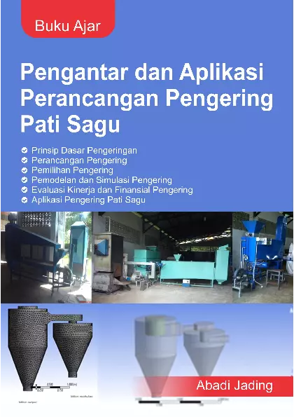 Sinopsis Buku Ajar: Pengantar dan Aplikasi Perancangan Pengering Pati Sagu Buku ajar ini membahas secara mendalam tentang prinsip dasar pengeringan, perancangan pengering, serta aplikasi pengeringan dalam proses pengolahan pati sagu. Fokus utama buku ini adalah pada dua jenis pengering yang digunakan secara luas dalam industri, yaitu *fluidized bed dryer* dan *pneumatic conveying dryer*. Materi ini disusun untuk memberikan pemahaman yang komprehensif mengenai mekanisme, karakteristik, dan pemilihan pengering yang tepat dalam konteks pengolahan pati sagu. Selain itu, buku ini juga menyajikan informasi mengenai alat ukur, metode pengukuran, dan contoh hasil pengukuran dalam proses pengeringan pati sagu, yang merupakan bagian integral dari pengendalian kualitas dan efisiensi dalam pengeringan. Informasi tersebut telah disusun secara terstruktur dan didukung oleh data serta contoh aplikasi nyata. Buku ini dirancang sebagai sumber belajar bagi mahasiswa, peneliti, serta praktisi di bidang teknik kimia, teknik industri, dan bidang terkait lainnya, yang tertarik memahami dan menerapkan konsep pengeringan dalam proses produksi pati sagu. Dengan pendekatan yang jelas dan sistematis, buku ini bertujuan untuk meningkatkan kemampuan perancangan, pemilihan, dan pengoperasian pengering dalam industri pengolahan bahan pangan.