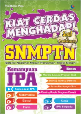 Sinopsis Buku: Buku ini merupakan kumpulan soal-soal Seleksi Nasional Masuk Perguruan Tinggi Negeri (SNMPTN) untuk kelompok kemampuan IPA, yang telah disusun secara sistematis dan terstruktur untuk membantu siswa dalam mempersiapkan diri menghadapi seleksi masuk PTN. Buku ini berisi soal-soal yang diujikan dalam beberapa tahun terakhir, yang terbukti memiliki pola dan kecenderungan berulang, sehingga menjadi acuan yang sangat relevan bagi siswa dalam memperkuat pemahaman dan keterampilan menjawab soal-soal SNMPTN. Buku ini terdiri dari dua bagian utama: *Uji Kemampuan I* dan *Uji Kemampuan II*, yang masing-masing berisi soal-soal Matematika, Biologi, Fisika, Kimia, serta IPA Terpadu. Setiap bagian dilengkapi dengan pembahasan yang jelas dan terperinci, sehingga memudahkan siswa untuk memahami konsep dan cara menyelesaikan soal secara efektif. Selain itu, buku ini juga menyediakan latihan soal yang disusun untuk menguji kemampuan siswa secara menyeluruh, sekaligus membantu mengidentifikasi materi yang masih perlu diperkuat. Dengan penyusunan yang terpadu antara soal dan pembahasan, buku ini menjadi panduan yang sangat berguna bagi siswa yang ingin meraih impian untuk masuk ke salah satu Perguruan Tinggi Negeri. Buku ini juga dilengkapi dengan informasi mengenai strategi memilih jurusan dan program studi yang sesuai, serta sistem perhitungan nilai dan skor SNMPTN, yang semuanya mendukung upaya siswa dalam meraih kesuksesan di jalur seleksi SNMPTN.