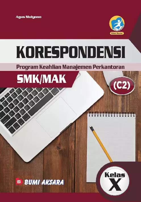 Buku Korespondensi ini ditulis sebagai salah satu sumber belajar siswa SMK MAK kelas X untuk memperdalam materi tentang Korespondensi Korespondensi mempelajari segala sesuatu tentang penggunaan teknologi dan penerapannya dalam aktivitas perkantoran Buku ini disusun berdasarkan Peraturan Direktur Jenderal Pendidikan Dasar dan Menengah Kementerian Pendidikan dan Kebudayaan Nomor 464 D D5 KR 2018 tentang Kompetensi Inti dan Kompetensi Dasar Mata Pelajaran Muatan Nasional A Muatan Kewilayahan B Dasar Bidang Keahlian C1 Dasar Program Keahlian C2 dan Kompetensi Keahlian C3 Selain itu buku ini ditulis secara umum dalam rangka ikut serta mencerdaskan bangsa Indonesia menjelang era globalisasi dalam perkembangan ilmu pengetahuan dan teknologi Anda dapat mempelajari buku ini sebelum dan sesudah dibahas oleh guru dan dapat mendiskusikannya dengan teman agar mendapatkan hasil belajar yang maksimal Setiap bab dalam buku ini dilengkapi dengan Kompetensi Dasar Kata Kunci Peta Konsep Tugas Info Rangkuman Refleksi Diri Soal Latihan dan Tugas Proyek Soal latihan diberikan beberapa jenis setelah akhir bab dan setiap akhir semester Pembahasan materi disajikan dengan bahasa yang lugas dan mudah kalian pahami dari pembahasan secara umum ke pembahasan secara khusus Sebelum membaca rangkuman materi diharapkan kalian membuat rangkuman sendiri terlebih dahulu yang nantinya dibandingkan dengan rangkuman dalam buku sehingga kalian dapat membandingkan pokok materi apa saja yang dianggap penting untuk dirangkum dan meningkatkan pemahaman kalian Pada akhir buku juga dilengkapi dengan Glosarium dan Indeks