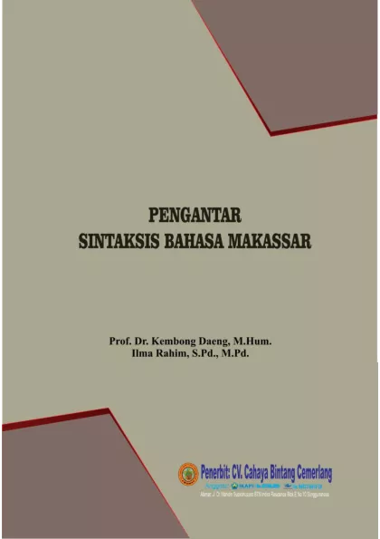 Buku Pengantar Sintaksis Bahasa Makassar ini menyajikan sebuah panduan mendalam mengenai struktur kalimat dan aturan sintaksis yang berlaku dalam bahasa Makassar salah satu bahasa daerah yang digunakan di Sulawesi Selatan Buku ini bertujuan untuk memperkenalkan pembaca pada aspek dasar sintaksis seperti susunan kata frasa klausa dan kalimat dalam bahasa Makassar