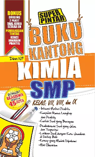 Sinopsis Buku Kantong Kimia SMP Kelas VII, VIII, dan IX Buku Kantong Kimia ini dirancang untuk memudahkan siswa SMP dalam mempelajari konsep-konsep kimia secara runtut, lengkap, dan tuntas. Buku ini disajikan dalam ukuran saku agar praktis dan mudah dibawa ke mana saja, baik saat belajar di sekolah maupun di rumah. Isi buku mencakup materi kimia untuk tiga tingkat kelas, yaitu Kelas VII, VIII, dan IX, dengan penjelasan yang jelas dan terstruktur, sehingga memudahkan pemahaman siswa. Buku ini juga dilengkapi dengan ilustrasi dan penjelasan yang disusun agar sesuai dengan kurikulum dan metode pembelajaran yang efektif. Dengan pendekatan yang komprehensif dan mudah dipahami, Buku Kantong Kimia ini menjadi panduan yang tepat untuk memperkaya pengetahuan siswa tentang ilmu kimia.