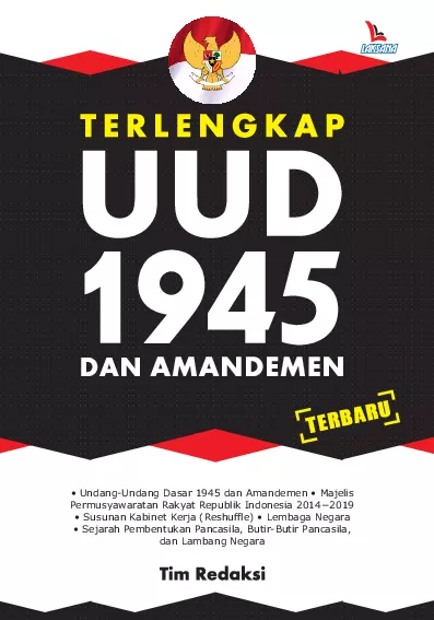 Undang Undang Dasar 1945 merupakan fondasi hukum negara Indonesia sehingga setiap warga negara harus mengetahui memegang teguh dan mengamalkannya Hadirnya buku ini akan membuat Anda mengetahui memahami dan mengamalkan isi UUD 45 beserta amandemennya I II III dan IV Presiden Joko Widodo dan Wakil Presiden Ma ruf Amin yang baru saja terpilih untuk periode jabatan 2019 2024 tentu untuk menjalankan amanah akan berdasar kepada hukum negara tersebut Buku ini merupakan paket komplet karena Anda akan mengetahui dengan jelas tentang susunan Kabinet Indonesia Maju 2019 2024 7 Perintah Presiden untuk Kabinet Indonesia Maju Dewan Perwakilan Rakyat Dewan Perwakilan Daerah Majelis Permusyawaratan Rakyat Republik Indonesia 2019 2024 dan masih banyak lagi Segera ambil buku ini dan perkaya pengetahuan Anda sebagai warga Indonesia Selamat membaca